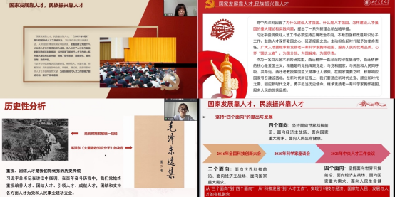在学习过习近平总书记在2021年中央人才工作会议上的讲话后,一部分积极分子将人才的重要性内化于心,有了自己的深刻理解。高嘉蔚将中央人才工作会议的精神与毛泽东同志在《大量吸收知识分子》中的观点相结合,她认识到:重视、团结人才是我们党优秀的历史传统。习近平总书记在讲话中也强调,在百年奋斗历程中,我们党始终重视培养人才、团结人才、引领人才、成就人才,团结和支持各方面人才为党和人民事业建功立业。杨紫嫣说:“习近平总书记发表重要讲话,从党和国家事业发展全局的高度,全面回顾了党的十八大以来人才工作取得的巨大成就,深入分析了人才工作面临的新形势新任务新挑战,科学回答了新时代人才工作的一系列重大理论和实践问题,明确了指导思想、战略目标、重点任务、政策举措。习近平总书记的讲话高屋建瓴、视野宏大、内涵丰富、思想深刻,具有很强的政治性、思想性、理论性,是指导新时代人才工作的纲领性文献,为做好新时代人才工作指明了前进方向,提供了根本遵循。”