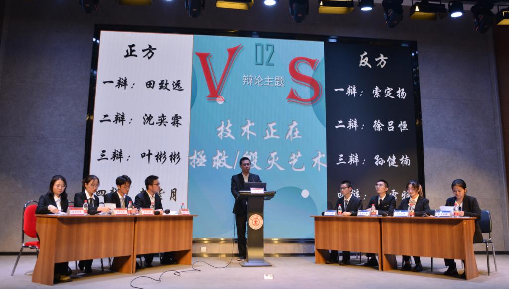 本次直播公开课,共进行了两场辩论赛,这些学生来自不同的专业和学院,他们围绕“艺术”这个中心展开辩论。第一场辩论赛的辩题是“艺术有/无雅俗之分”,8位辩手古今中外、旁征博引,从古代名曲“广陵散”到西方古典作品“月光奏鸣曲”,从王羲之的“兰亭序”到莎士比亚的“仲夏夜之梦”,辩论现场思想交锋激烈,妙语连珠言辞犀利。第二场辩论赛的辩题是“技术正在拯救/毁灭艺术”,辩论队员们围绕“技术与艺术”、“拯救与毁灭”展开辩论,从灵感思维到AI技术,从梵高画作、作曲家创作到机器绘画与算法音乐,甚至延伸至市场经济,正反方各执己见,敏锐思考,奋力以辩。来自电气与信息专业大一学生赵绍宇同学担任本次辩论赛主席。