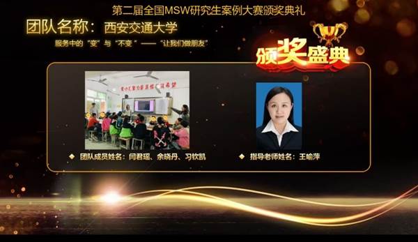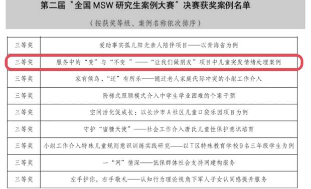 2020级社会工作专业硕士生余晓丹、习钦凯、贺佳贝,2021级专业硕士生闫君瑶、谢江、梁珂晨、袁智群、张佳琪、亓宇尧、谢咏琪共12名同学,王瑜萍、彭瑾、孙晓冬三名指导教师,组成三支参赛队伍。最终,案例《服务中的“变”与“不变”——“让我们做朋友”项目中儿童突发情绪处理案例》、《轻松育儿,携手成长——家庭积极教养小组》入选百强案例。其中由王瑜萍老师指导,闫君瑶、余晓丹、习钦凯同学写作的《服务中的“变”与“不变”——“让我们做朋友”项目中儿童突发情绪处理案例》入选全国36强,经过决赛答辩,最终摘得三等奖。本次案例大赛作品,均在社会工作专硕协同育人实践基地形成,是 161sex