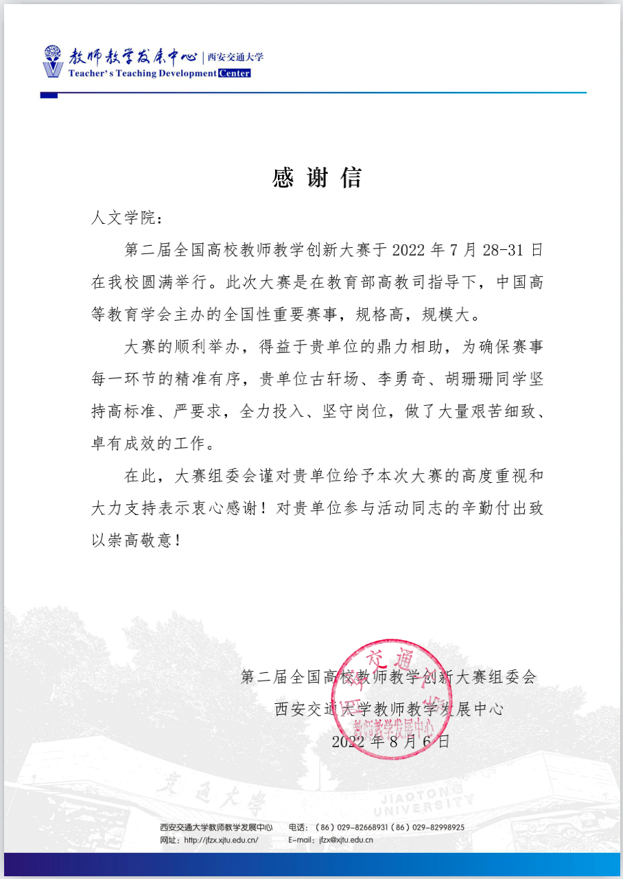 古轩场、李勇奇、胡珊珊三位同学自愿参加志愿服务,坚持高标准严要求,尽职尽责完成工作任务,大赛组委会对三位志愿者同学对本次大赛的支持表示感谢,特写来感谢信。希望受表彰的同学再接再厉,积极参与学校的工作,在今后的学习和工作中取得更大的成绩!