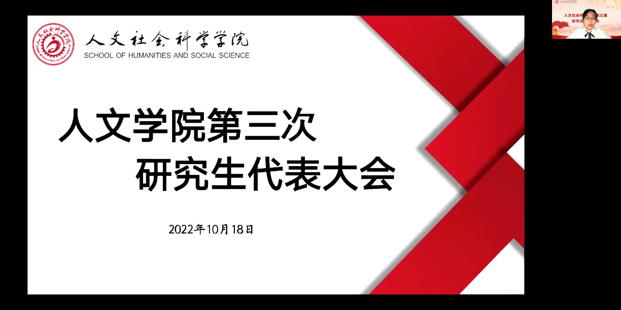 人文学院第三次研究生代表大会于线上召开。本次大会共有60名研究生代表参加,人文学院党委副书记王劲,团工委书记、辅导员闫潇作为嘉宾出席会议。大会由人文学院研会康璇主持。