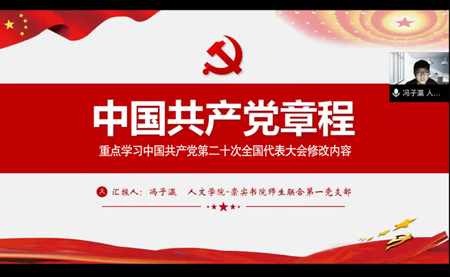 人文学院-崇实书院师生联合第一党支部书记冯子瀛同学以“重点学习中国共产党第二十次全国代表大会修改内容”为题领学《中国共产党章程》,从“两个结合”、时代精华、第二个百年奋斗目标、发扬斗争精神,增强斗争本领、初心使命、“十个坚持”的宝贵历史经验等二十八个关键词,以内容对比的形式详细阐明党的二十大通过的《中国共产党章程》的重要修改。