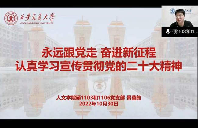 人文学院硕1103和1106党支部书记景菖皓同学以“永远跟党走 奋进新征程 认真学习宣传贯彻党的二十大精神” 领学党的二十大报告,详细介绍了党的二十大报告主题、内容,用具体实例展现过去五年的工作和新时代十年的伟大变革,阐释了“两个确立”的决定性意义、开辟马克思主义中国化时代化新境界与新时代新征程中国共产党的使命任务,他号召全体青年学生“要做有理想、敢担当、能吃苦、肯奋斗的新时代好青年,作为党员更要学懂、弄通、用好党的二十大精神。”