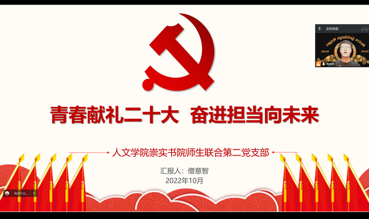 人文学院-崇实书院师生联合第二党支部宣传委员僧意智同学以“青春献礼二十大 奋进担当向未来”为题领学党的二十大报告部分章节,分享了党的二十大报告中第一次把科教兴国战略、人才强国战略、创新驱动发展战略放在一起,以及首次单独把法治建设作为专章论述相关内容的学习心得,他说“我们要把自己的专业和国家发展相结合,做不负时代众望的青年。”