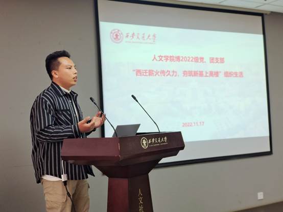 为深入学习宣传贯彻党的二十大精神,切实推动党的二十大精神深入人心,传承与弘扬“西迁精神”,激励青年学子奋进前行,11月17日下午,人文学院博2022级党、团支部召开“西迁薪火传久力,夯筑新基上高楼”专题组织生活。博2022级党支部成员、团支部成员以及部分群众参加会议,党支部书记杨贵龙主持会议。