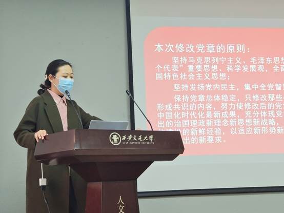 之后,党支部组织委员兼团支部书记田琳带领参会同学共同学习《中国共产党章程(修正案)》。《中国共产党章程》是管党治党的总章程、总规矩,是中国共产党最根本的党内法规。学习《中国共产党章程》是每一位共产党员、发展对象、入党积极分子等的必修课。田琳同学从党章修改的时间、原则、具体内容等多方面为同学们介绍党章的修订。而《中国共产党章程》从中共一大到二十大历经20次的修改与完善,正是体现了党的理论创新、实践创新和制度创新的时代特色,彰显了中国共产党人推陈出新、与时俱进的创造精神。