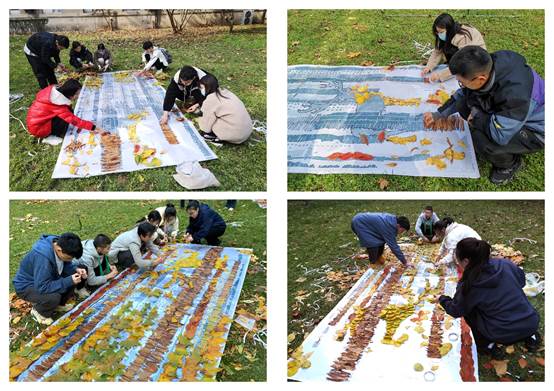 在艺术实践中,课程鼓励、开发同学们的艺术创造力。老师与助教带队在校园寻找合适的叶色、叶形,学生利用课余时间分批次制作,在欢声笑语中共度金秋快乐时光。特别是在实践过程中,学生们“因叶、因色、因地制宜”,不断提出新的创意,大胆地进行二次艺术创作,为作品增加了不少趣味和互动氛围。因秋叶颜色存续时间短,师生抓紧时间制作,现场解决安装难题,历时3天终于完成了全部艺术实践。