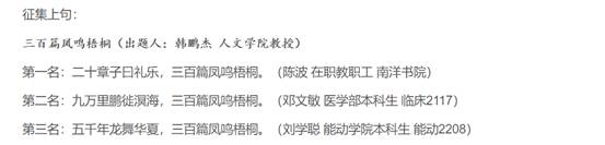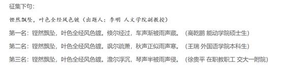 “以诗会友”活动上,李明老师和人文学院教授韩鹏杰还被邀请为联对的出题人,李明老师出上句“铿然飘坠,叶色全经风色镀”征集下句,韩鹏杰老师提供了下句“三百篇凤鸣梧桐”征集上句。两百余名参与者争相为两句联句提供对句,最终各评选出三份优秀作品。