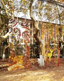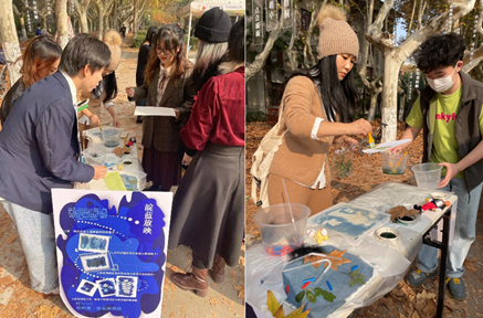 梧桐道上吸引众多行人目光的“梧桐印记”、“靛蓝放映”等活动也是人文学院艺术系的成果。人文学院教师董琪和吴雪共同教授通识课程“图形创意”,讲解同构、混纬空间、异影等设计手法,此次“金色梧桐节”上的“靛蓝放映”活动就是综合运用课程所学的呈现。活动参与者们运用蓝晒法,在浸泡了蓝晒液体的白布上自由设计喜爱的图案,日晒后布料上便会留下图形的剪影,趣味性十足。