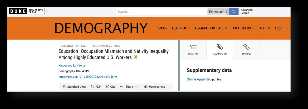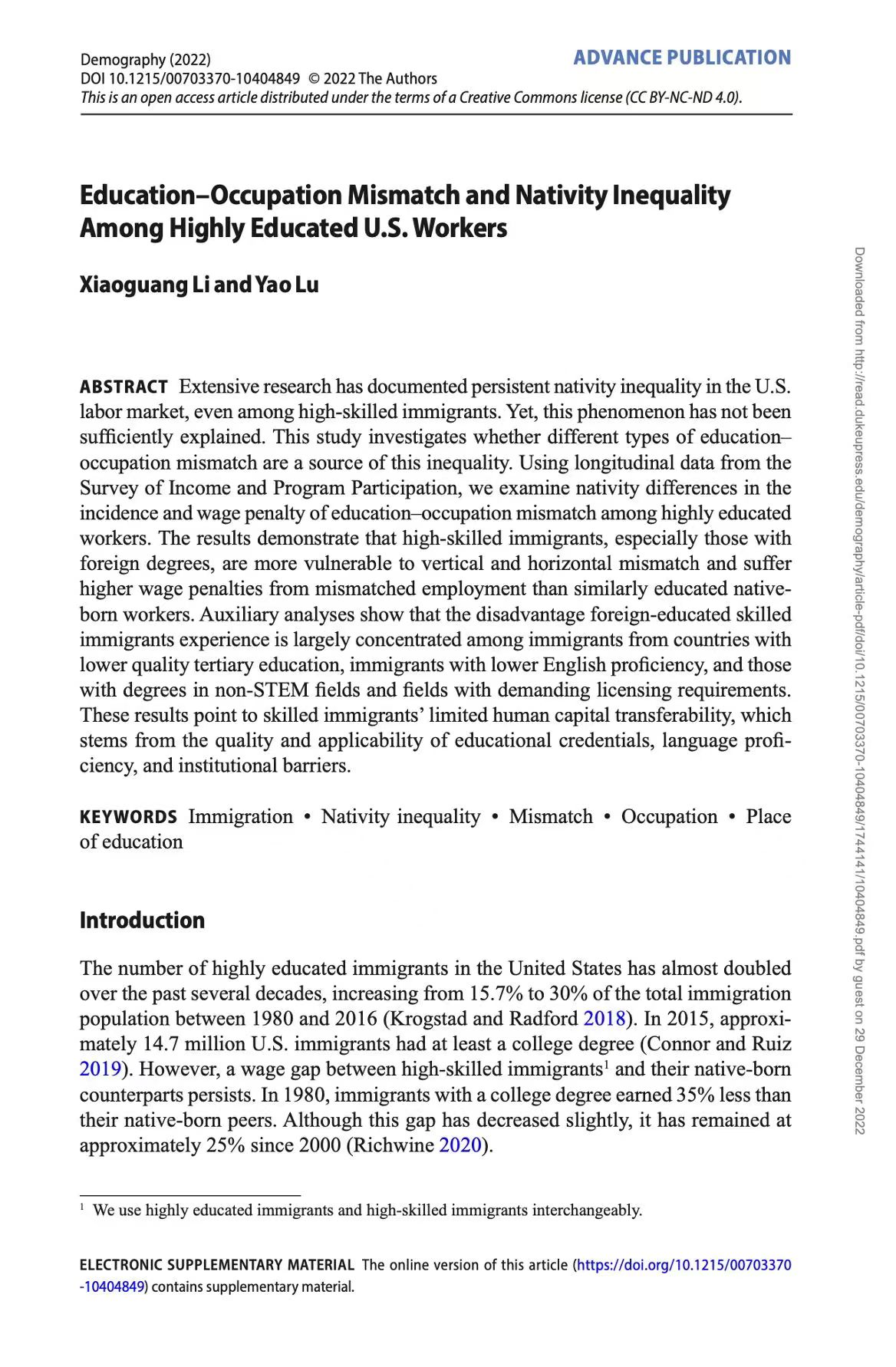 社会学系青年教师李晓光与哥伦比亚大学社会学系陆瑶教授合作完成的论文“Education–Occupation Mismatch and Nativity Inequality Among Highly Educated U.S. Workers”被国际权威期刊Demography正式接受并在线发表,李晓光为该文的第一作者兼通讯作者。Demography于1964年创刊,是美国人口学会的旗舰刊物,属于国际公认的社会学与人口学领域的顶尖英文刊物。该研究成果获得国家自然科学基金青年项目的经费支持(项目批准号72204196)。