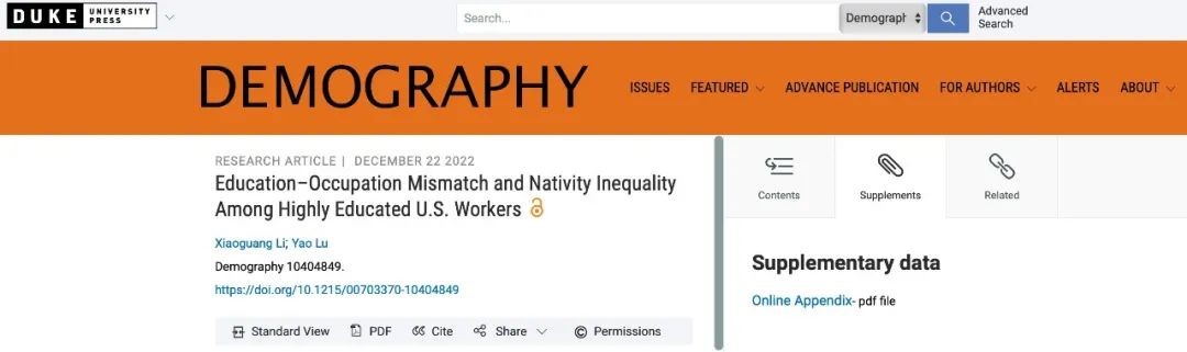 社会学系青年教师李晓光与哥伦比亚大学社会学系陆瑶教授合作完成的论文“Education–Occupation Mismatch and Nativity Inequality Among Highly Educated U.S. Workers”被国际权威期刊Demography正式接受并在线发表,李晓光为该文的第一作者兼通讯作者。Demography于1964年创刊,是美国人口学会的旗舰刊物,属于国际公认的社会学与人口学领域的顶尖英文刊物。该研究成果获得国家自然科学基金青年项目的经费支持(项目批准号72204196)。