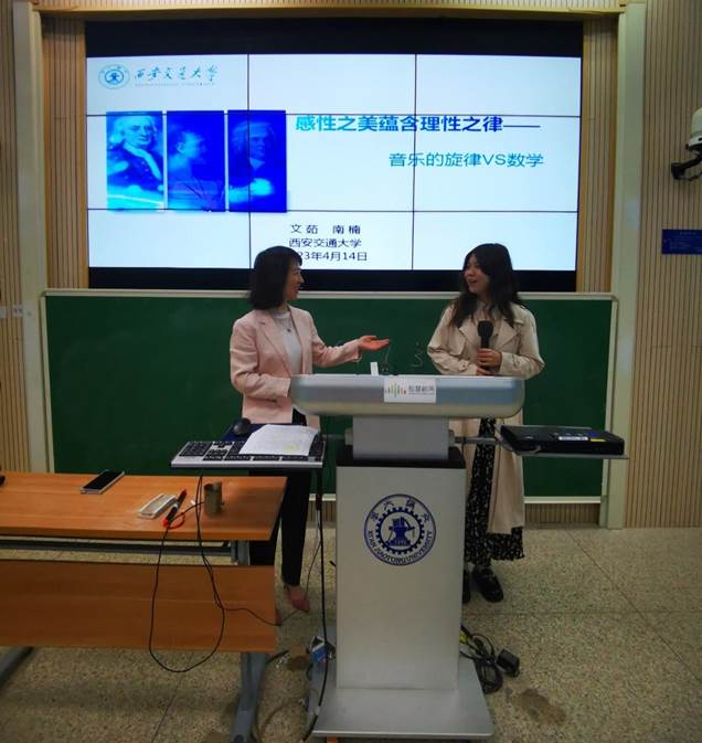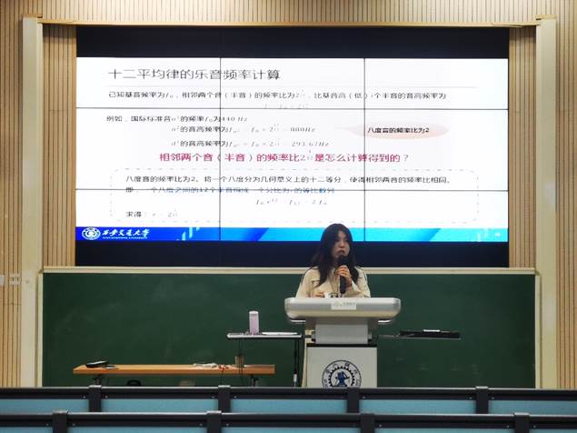 人文学院音乐教育中心文茹老师和前沿院艺术科学与表达交流中心南楠老师联合主讲,主题为“感性之美蕴含理性之律——音乐的旋律VS数学”。本次课程将音乐与数学两个学科进行交叉融合,以美育之感性合数学之理性,引导学生在音乐中体会其中蕴含的数学规律之美,带领学生体悟真与美的密切联系。