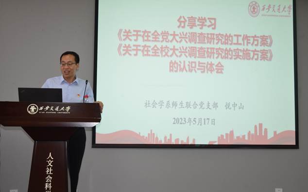 在读书班环节,社会学师生联合党支部书记悦中山教授带领大家学习了《关于在全党大兴调查研究的工作方案》《关于在全校大兴调查研究的实施方案》,并分享了自己的认识和体会。他结合社会学学科开展调查研究的启示,强调通过坚持正确的理论、采用正确的调查与分析方法,及时吸纳大数据等可行的新方法,避免先入为主、调而不研、高谈阔论等不正确的调查研究,通过开展调查研究做到“真研究问题、研究真问题”,运用好调查研究的成果,真正解决我们工作中面临的问题。