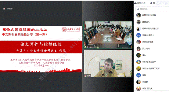 5月29日,为迎接庆祝第七个“全国科技工作者日”,人文学院以线上线下相结合的方式举办“把论文写在祖国的大地上”中文期刊发表经验分享活动(第一期)。活动由人文学院社会学系师生联合党支部、社会学系、实证社会科学研究所、西安交大归国留学人员联谊会人文学院分会联合举办,邀请社会学博士候选人张骞进行分享,社会学系师生联合党支部书记悦中山主持活动。本次活动吸引了来自北京大学、上海交通大学、复旦大学、四川大学、兰州大学、河海大学等在内的20多所国内高校的近400名师生线上线下共同参加。