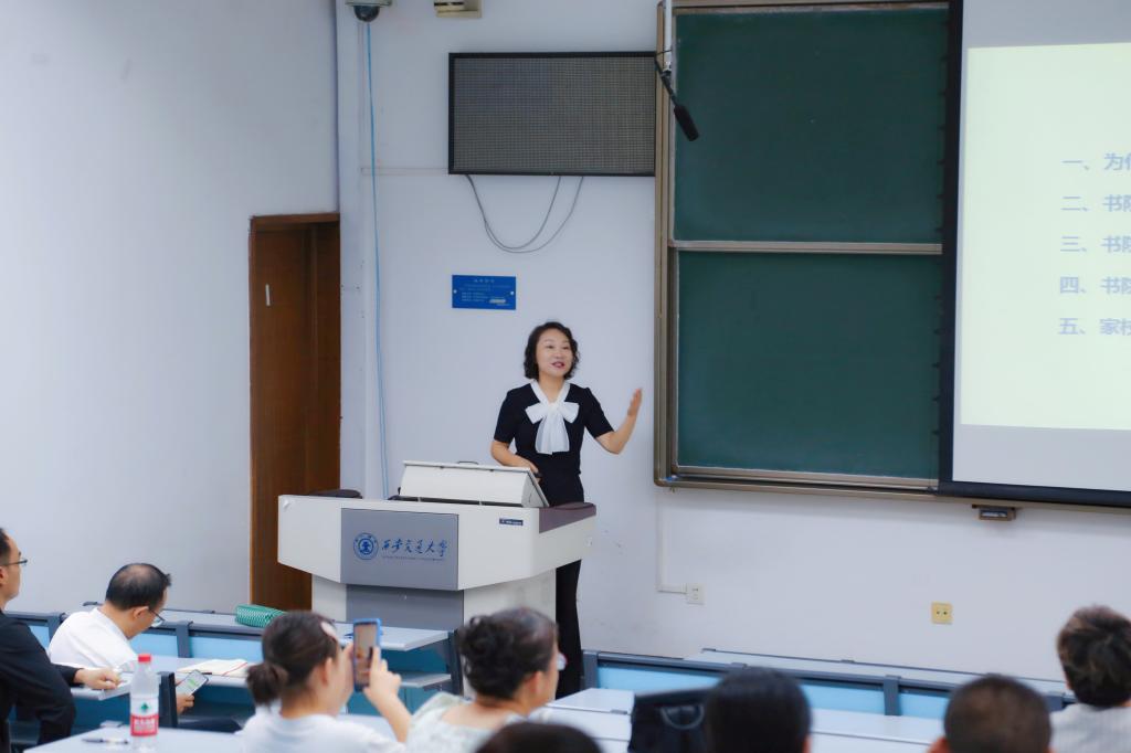 纪梦然书记代表人文学院党政领导班子致辞,对家长们对学校和学院工作的认可与信任表达感谢。纪梦然书记表示,学院将尽最大的力量去关心、帮助学生成长成才,努力为学生提供服务、排忧解难,把学生培养成为具有家国情怀、追求卓越的优秀人才,希望家长们积极与学院深度协同配合,关注学生学业进展、心态变化、情感需求等方面,家校联动共同为学生的未来发展保驾护航。