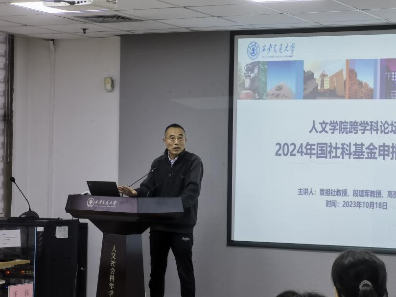 为深入学习贯彻党的二十大精神,加强国社科基金项目申报工作的谋划组织,进一步推动人文社科科研工作高质量发展,2023年人文学院跨学科论坛继9月22日邀请公管学院张思锋教授之后,于10月18日下午在主E703会议室再次举办2024年度国家社科基金项目申报专题辅导会。本次邀请了国家社科基金重大项目首席专家陕西师范大学袁祖社教授、西北大学段建军教授及西安音乐学院高贺杰教授作专题辅导。社科处副处长张日鹏、人文学院党委书记纪梦然,以及院内外中青年教师70余人聆听报告并进行了交流。辅导会由人文学院科研副院长王伟教授主持。