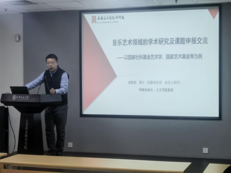最后,高贺杰教授作题为《音乐艺术领域的学术研究及课题申报交流》的辅导讲座。他提到要注意避免“重立项、轻结项”的问题,自觉增强学术自觉和契约精神。他通过近五年音乐类院校获批立项情况对比,分析了艺术学科如何将研究优势与国家需求进行立体化整合,有效提升申报成功率。