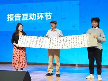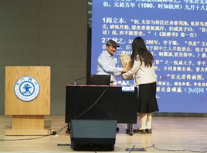 此次报告收获了广大师生的热烈反响。报告结束后,同学们自发地为李松教授献花,人文学院书法专业的周俞林同学还将自己临摹的宋代苏轼《黄州寒食诗帖》书法作品一副敬赠李松教授。