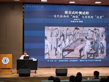 李松教授通过近年来《清明上河图》等在故宫博物院展出时引发的“故宫跑”现象引入,为同学们介绍了当前大众对宋文化关注的热潮。讲座分为上、下两篇,上篇李教授对宋代绘画的“相貌”及时代环境做了全方位的立体介绍,下篇则分析了宋代文学艺术中的重要一环—苏轼的文化艺术观。结合大量的画作、画史和画论,李教授为同学们呈现了由唐入宋后的中国绘画相貌,并从十三个方面分析了苏轼这一被后人尊为士人典范的文化艺术观。