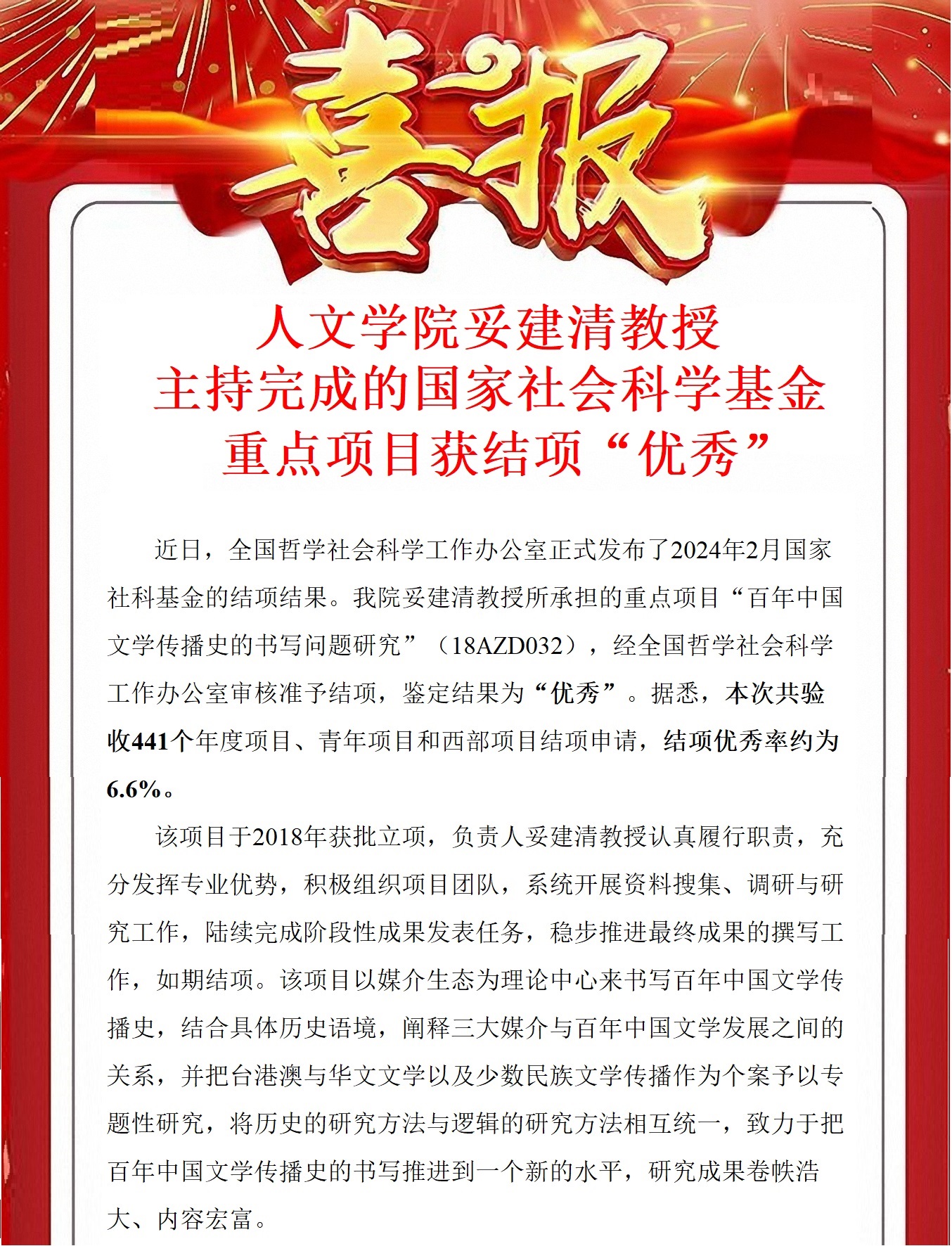 喜报 | 人文学院妥建清教授主持完成的国家社会科学基金重点项目获结项“优秀”