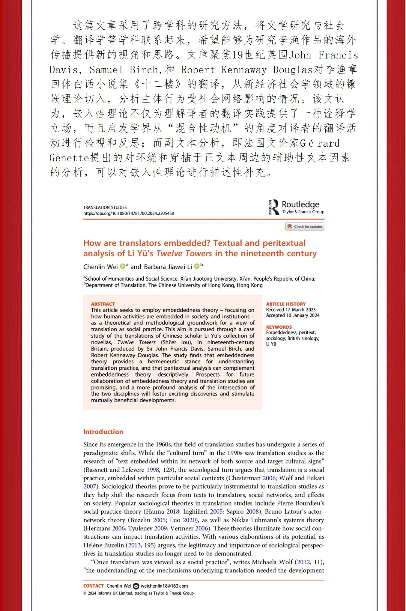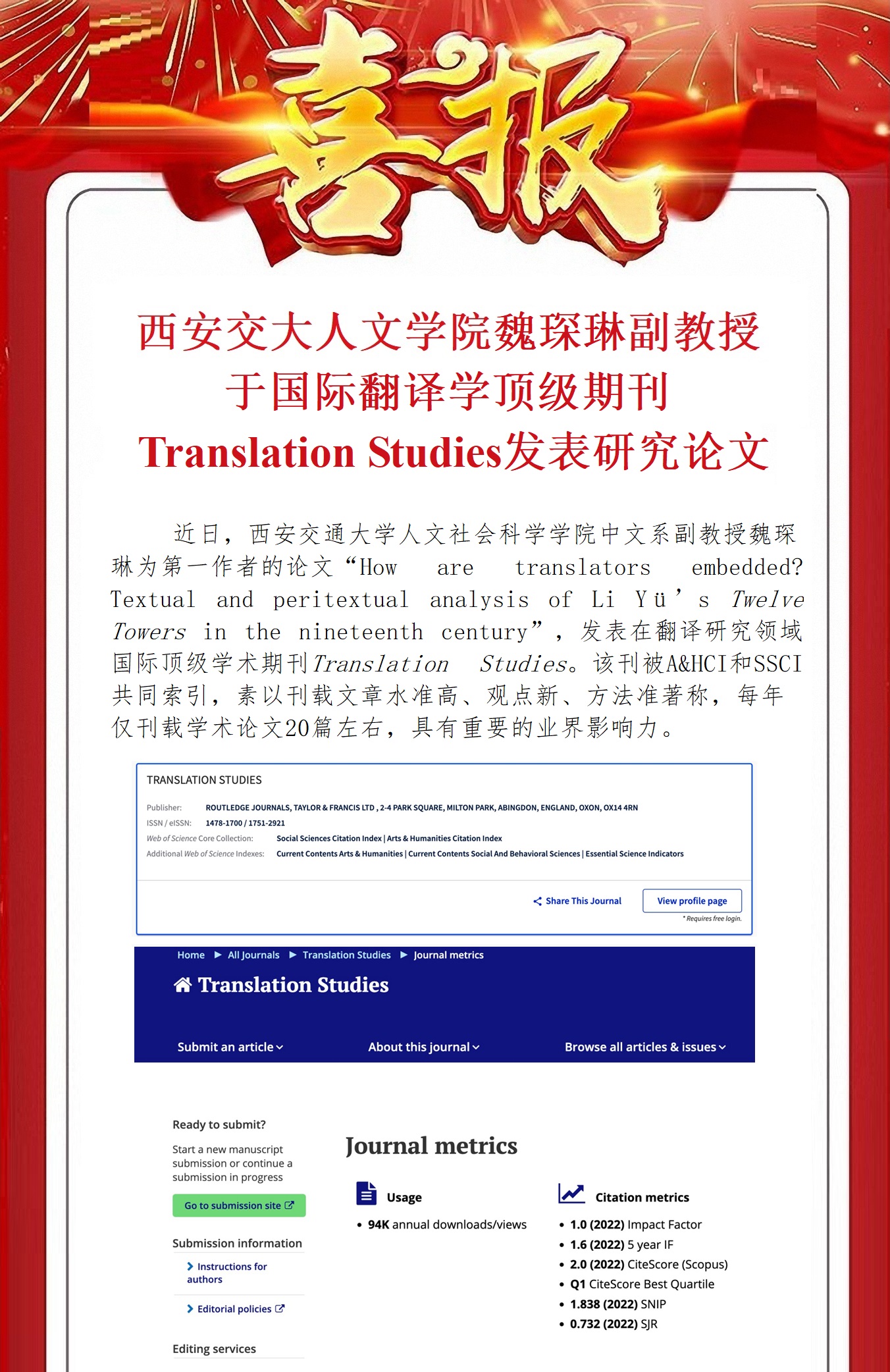 喜报 魏琛琳副教授于国际翻译学顶级期刊Translation Studies发表研究论文