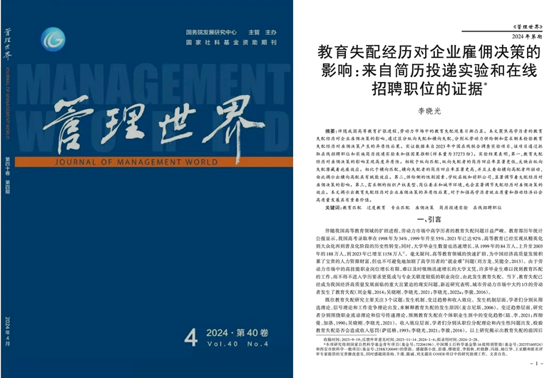 社会学系李晓光副教授完成的研究《教育失配经历对企业雇佣决策的影响:来自简历投递实验和在线招聘职位的证据》于《管理世界》2024年第4期发表。《管理研究》是由国务院发展研究中心主办的经济管理理论刊物,2023年复合影响因子为31.204,综合影响因子为22.557,是中国人文社会科学期刊综合评价指标体系(AMI)管理学领域排名第一的顶级期刊。该研究成果获得国家自然科学基金青年项目和中国博士后科学基金特别资助项目的经费支持。