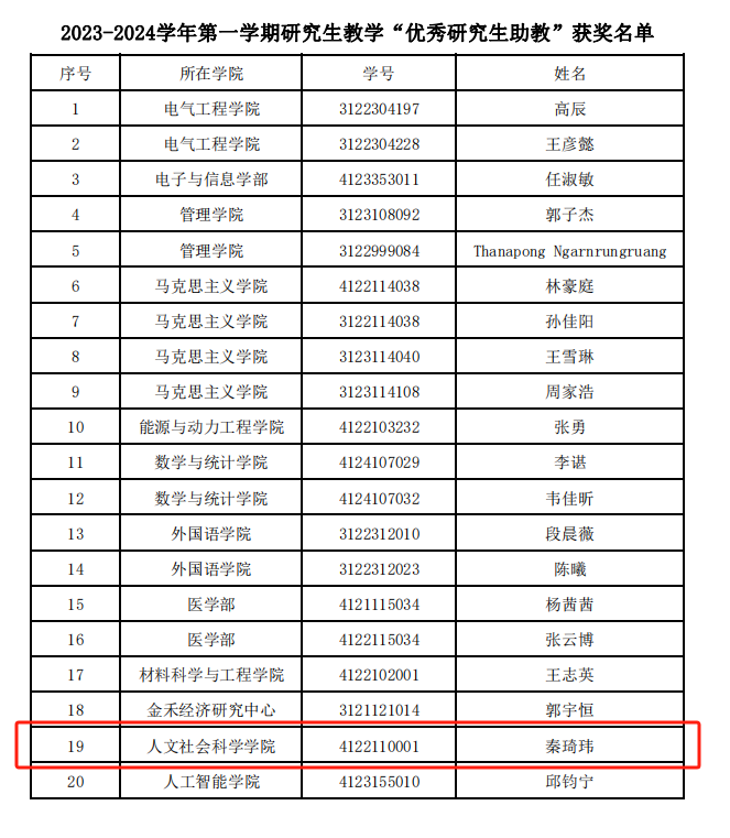 人文学院博士研究生秦琦玮在2023年秋季学期中获得校级“优秀研究生助教”荣誉称号。