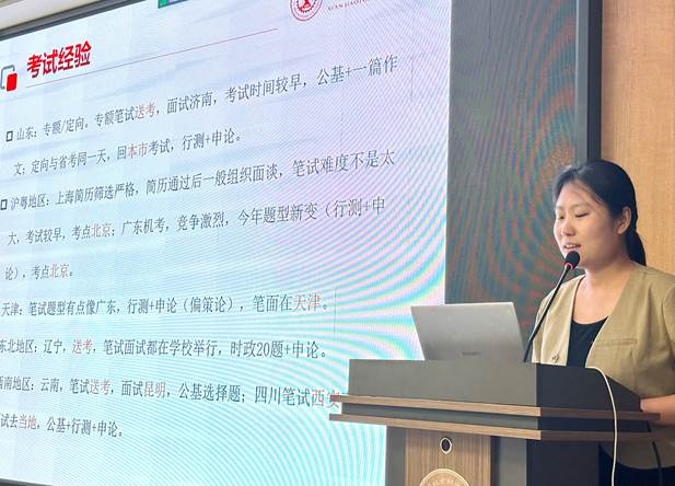 江苏省选调生张皓月从江苏选调的选调条件、选调流程、选调岗位及其报录比情况、笔试题型等为同学们进行细致的分享。她提到在前期准备笔试部分要选择适合自己的资料,针对性的学习专项课程,大量练习相关习题,保持良好心态;后期考察部分要对专业学习的收获、学生工作经历、时事政治的积累、论文和专业比赛等个人经历进行梳理,多和同学进行模拟练习。