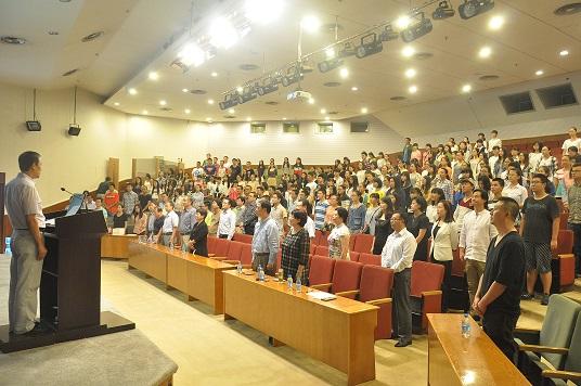 在奏唱校歌声中,人文学院2015级新生入学教育大会圆满结束。