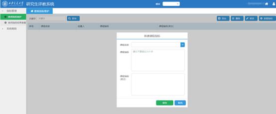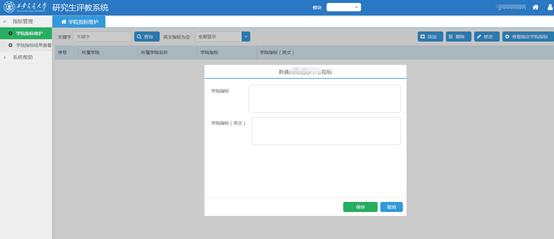 研究生评教指标体系分为学校指标、学院指标和教师指标三个层次。学校指标由研究生院负责维护,评价结果作为研究生课程绩效考核的参考依据。