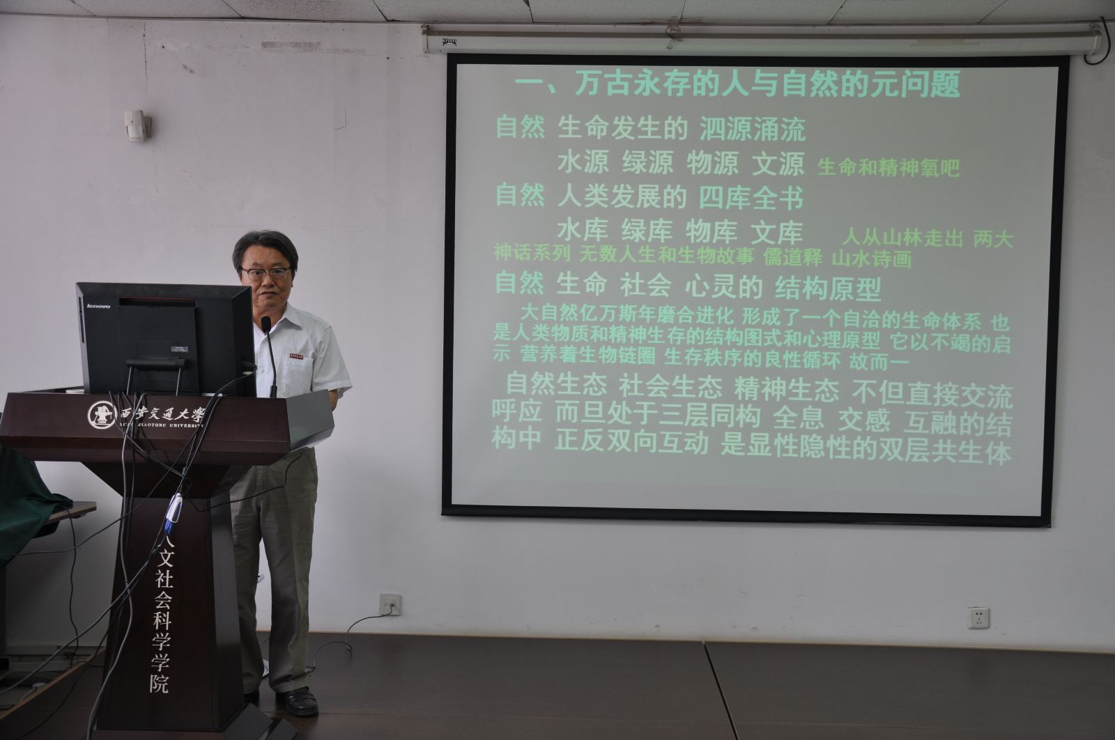 肖云儒教授的讲座主要围绕“万古永存的人与自然的元问题、万古长青的中国古典绿色文化观、万古延续的中国古典绿色生存实践”等方面展开。肖老师旁征博引、深入浅出,以丰富的古代典籍和先人的哲思为支撑,深入阐述了人和自然、人与人、人与心的关系。指出:“中国古典绿色文化是中国千年的民族梦,是和谐中国、美丽中国、生态中国历史的优秀传统和当下的有机构成,是实现中华民族伟大复兴的一个重要文化路径。绿色生存是人类生存、世界大同的终极目标,古典绿色文化也是中国文化和东方美学的重要源头,是民族文化独有的魅力和实力。社会的发展、人生的进步,仍有赖于中华文化的儒道互补、或儒道释三足鼎立的结构,不要偏废,但在不同阶段、不同地域、不同人生的发展阶段,可以倚重某方面。”