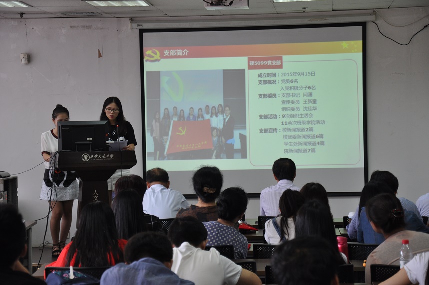 会上,先进党支部和优秀共产党员代表分别做交流发言。社会学系党支部书记童梅同志以“包容多元、传递温暖、共同发展”为主题,展示了支部近两年来的工作做法、工作特色、突出成绩以及未来努力方向;硕士5099党支部书记闫潇同学从组织建设、思想作风建设、支部氛围建设、发挥党员先进性作用等方面,汇报了学生党建工作的风采;优秀共产党员代表张宏邦同志从坚定理想信念、提高政治觉悟,立足本职工作、增强大局意识,坚持以知促行、争做优秀党员三个方面谈了他本人和传播学系全体党员的学习工作状态;迟凯文同学以“实现中国梦,青春勇担当”为主题,阐释了“以青春之我,创建青春之家庭,青春之国家,青春之民族,青春之人类,青春之地球,青春之宇宙”的内涵。