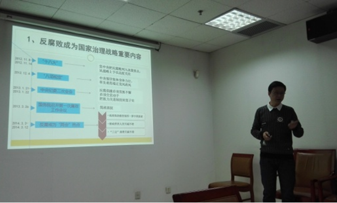 马克思主义学院思想政治教育研究所青年骨干教师韩锐做了题为《党风廉政建设与反腐败形势》的主题报告。