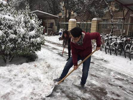 雪景固然美丽,也为师生出行带来了诸多不便。硕7093、7096党支部和团支部的同学们积极响应扫雪倡议书的号召,组成扫雪小分队,加入到清扫积雪的活动中。其中西14-15舍之间的区域被同学们列为重点清扫“对象”,一方面是为了方便学生出行,另一方面,西14舍下有个单车车棚、一处配钥匙的地方,人流量较大,更需要尽快清扫。除此之外,有的同学加入了团委、研会组织的扫雪小分队中,进行了其它区域的清扫。