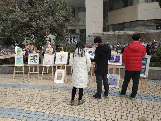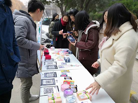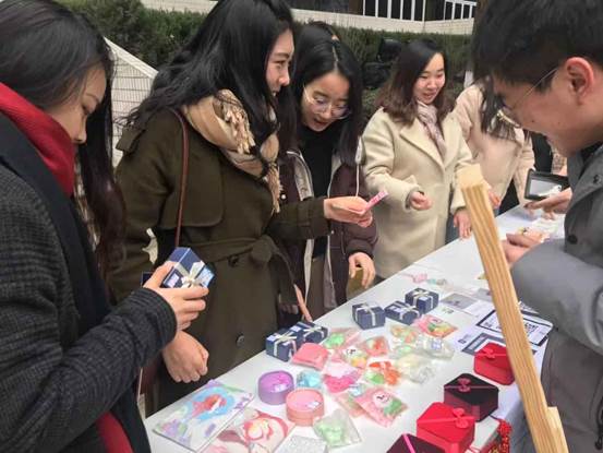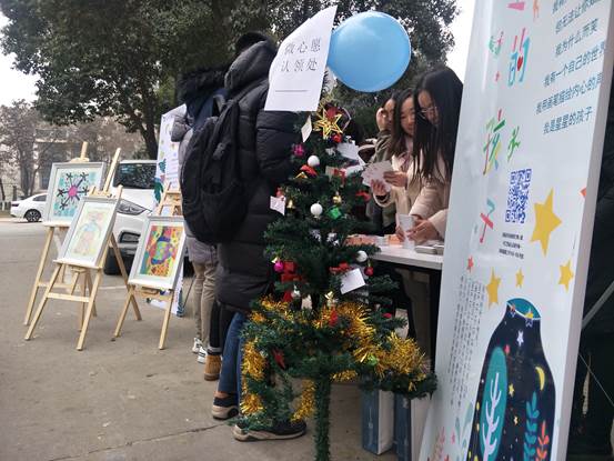 12月22日,硕8088党支部与校研会实践部联合举办“关注自闭症儿童,为星星点灯”活动,从12月19日开始已经持续四天。这也是研会每年的常规活动,呼吁大学生以义卖的方式为自闭症儿童献出爱心。在他们身边的小桌子上摆放着各种各样精美的小物件,这些都是自闭症儿童亲手制作的工艺品,在这里也是为他们募集善款的义卖商品。路过的同学们纷纷驻足,挑选着自己心仪的小物品,献出自己的一份爱心。