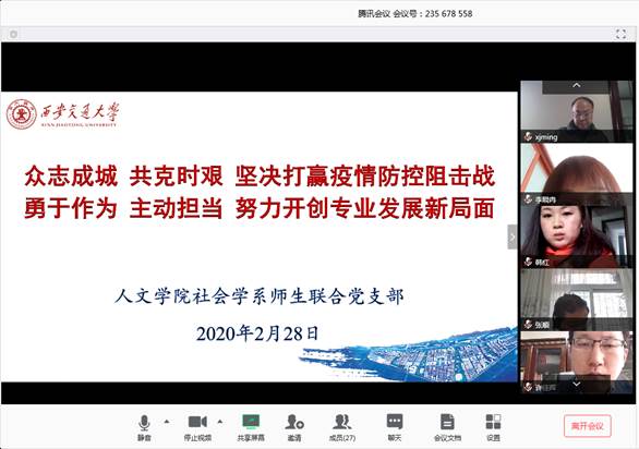 为进一步响应学院分党委的号召,人文学院所有教工党支部和师生联合党支部纷纷开展组织生活会,学习中共中央印发的《关于加强党的领导,为打赢疫情防控阻击战提供坚强政治保障的通知》及学校党委《关于进一步加强党的领导坚决打赢疫情防控阻击战的通知》等文件,讨论、交流疫情期间开展“停课不停学”直播教学的经验与困难,展开与疫情相关的科研,做到面对重大社会事件,人文师生主动作为。
