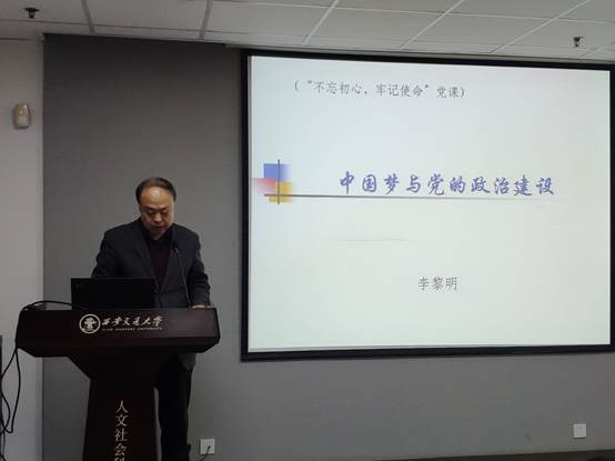 李黎明院长以“中国梦与党的政治建设”为主题,结合自己的研究领域,向大家介绍了中国社会转型及社会治理问题。强调中国目前的社会转型需要新的社会治理,这有赖于有效市场和有为政府共同作用建立有机社会。党的领导是实现这一目标的有力保障,新时期要持续加强党的政治建设。他系统的介绍了党的政治建设的内涵、为什么政治建设是党的根本性建设以及如何加强党的政治建设等问题。同时,李院长结合自己的调研情况,针对人文学院一流学科建设存在的问题,提出要打造跨学科研究平台,加大培养和引进中青年领军人才的力度,搭建稳定的国际联合培养合作高校,持续深化综合改革,真正以改革激发师生活力,推动学院发展。
