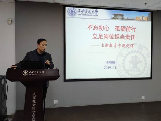 马晓彬书记在专题党课中首先介绍了人文学院主题教育开展情况,接下来引用习总书记在十九大报告中的原话,和全体党员重温共产党人的初心和使命。每一个党员,都要不忘初心,做到牢记历史、坚守政治灵魂、敢于担当、不忘人民群众和发扬民族精神。作为高校教师,更应担当起立德树人的教育使命。同时,他梳理了人文学院的历史沿革和发展现状,并针对主题教育中检视出的问题提出整改思路。号召全体师生党员以主题教育要求为目标,落实习总书记对“好老师”的标准以及对新时代青年的要求,聚焦“双一流”建设,共同推动学院发展,真正为哲学社会科学的繁荣做出贡献。