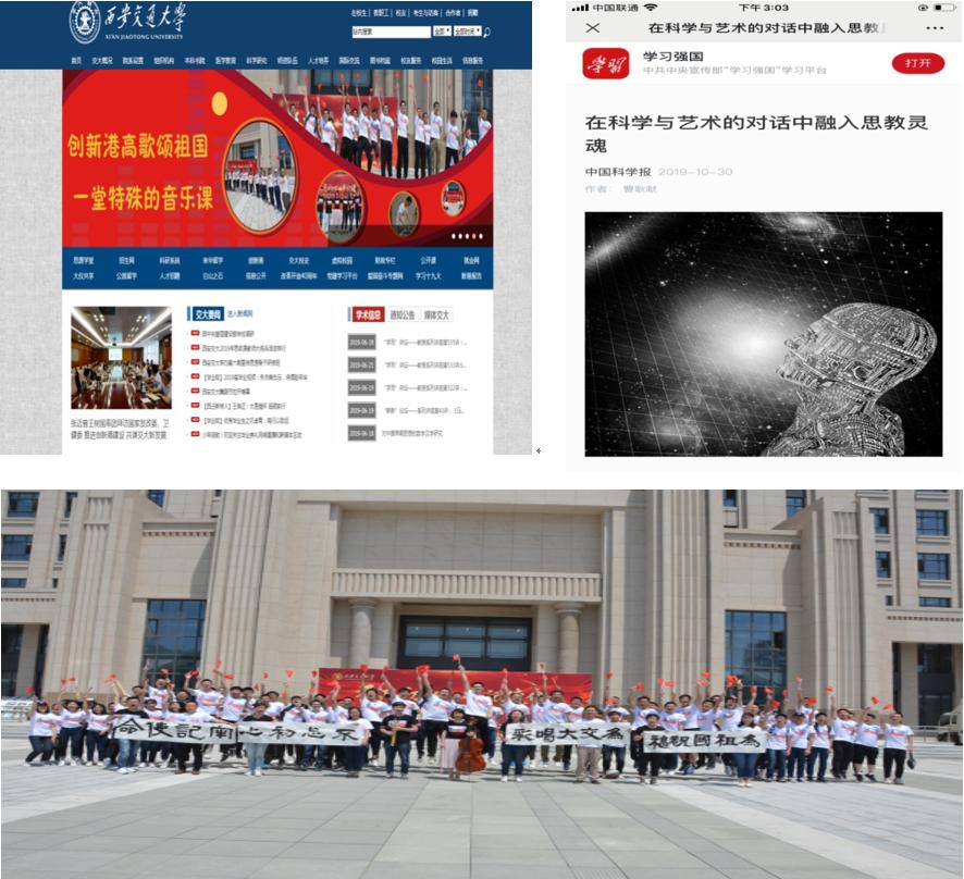 的第一批和第二批课程思政示范课程。《音乐鉴赏》课程在陕西省学习强国平台播出,中心党员教师撰写的文章被宣传部学习强国全文转载。支部从2017年开始与马克思主义学院联合,在思政课中融入音乐的内容,合作讲授了以“音符里的思想盛宴”“音乐中的理想信念”等为主题的交叉学科课程,取得了非常好的效果。《艺术欣赏与创作(音乐)》课程中,结合建国70周年,以“不忘初心,牢记使命”为主题,举办汇报音乐会和“快闪”活动,“活动受到100多家媒体关注,北京新华网、人民日报、中国文明网等 主页