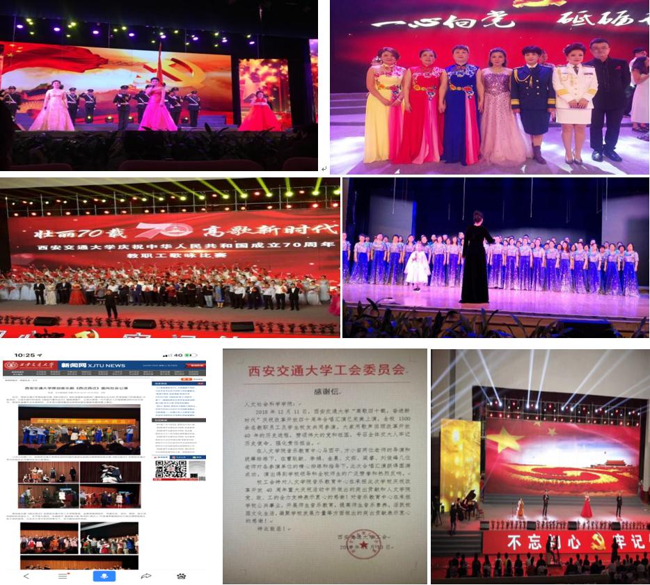 “喜迎19大文艺演出”、“改革开放40周年合唱汇演”、“中华人民共和国成立70周年合唱比赛”等多项大型活动的导演、指挥和演出工作。中心党员教师担任团委管乐团的指挥、承担排练任务,已经有多场演出。中心音乐教师为“西迁精神”的弘扬与传承排演的音乐剧《西迁西迁》受到社会各届的关注。