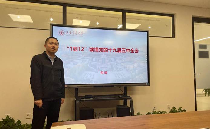 倪蒙以“‘1到12’读懂党的十九届五中全会”为主题,从1个建议,2个阶段,3个“新”,4(四)个全面“新”表述,5对关系,6个“十四五”主要目标,7个月准备,8场座谈会,9方面远景目标,10方面决胜全面建成小康社会决定性成就,11次考察,新时期发展12大主张等方面,带领支部成员学习十九届五中全会的相关内容与精神,以“乘风好去,长空万里,直下看山河”与大家共勉。