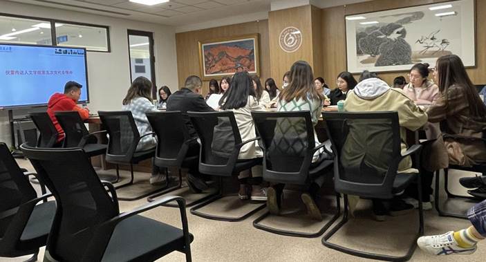 随后,倪蒙同志传达了人文学院第五次党代会精神,带领大家集体学习了党代会报告,结合学科发展和自身实际,展开了热烈讨论。大家纷纷表示,要以此次党代会为契机,主动融入时代潮流,助力学院发展。