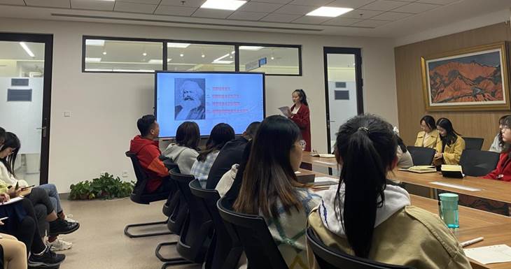 马克思主义学院中马所、历史所2020级研究生党支部书记王启慧发挥学科优势,梳理了社会主义的历史发展脉络,从空想社会主义、科学社会主义的产生、科学社会主义的实践以及增强中国特色社会主义自信四个方面带领大家学习了社会主义发展史,鼓励大家不断坚定理论自信、道路自信、制度自信与文化自信。