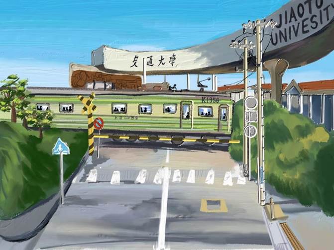 作为新时代的交大研究生,我们应牢记使命,弘扬校风,传承西迁精神。本幅作品整体风格偏古韵朴拙,将第三时期的校门嵌于国风插画之中,表达校门的历史感,突出校园文化的博大精深,此构图也体现了主题文字中“牢记使命”的“神圣感”。