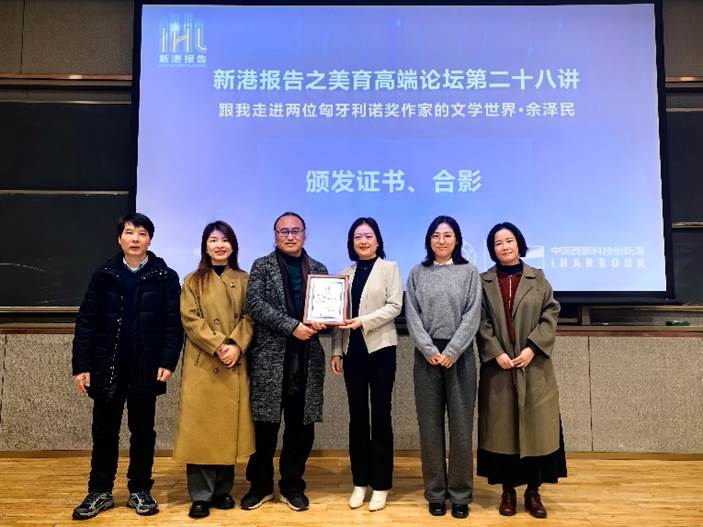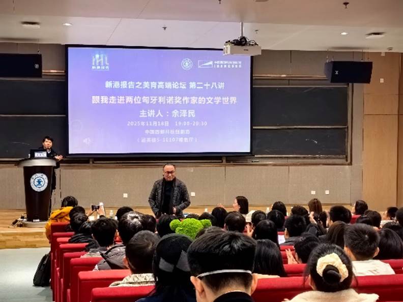 创新港校区涵英楼报告厅成功举办。本次论坛以“跟我走进两位匈牙利诺奖作家的文学世界”为主题,特邀余泽民教授担任主讲嘉宾,余教授是旅匈作家、匈牙利语翻译家,中国作家协会会员。他先后翻译包括2002年诺奖作家凯尔泰斯、2025年诺奖作家克拉斯诺霍尔卡伊多部作品在内的近三十部作品,被匈牙利政府授予“匈牙利文化贡献奖”,被称作“当代匈牙利文学的中国声音”。人文学院副院长张勇担任主持人,人文学院党委书记纪梦然、中文系主任王瑶和教师代表出席,全校各学院同学积极参与。